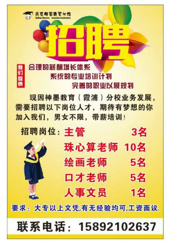您當(dāng)前的位置:★霞浦搜才網(wǎng) >> 霞浦縣招聘信息 >> 霞浦縣教育/培訓(xùn)/科研/院校行業(yè)招聘信息 >> 北京神墨珠心算教育中心霞浦分公司招聘口才主管和老師